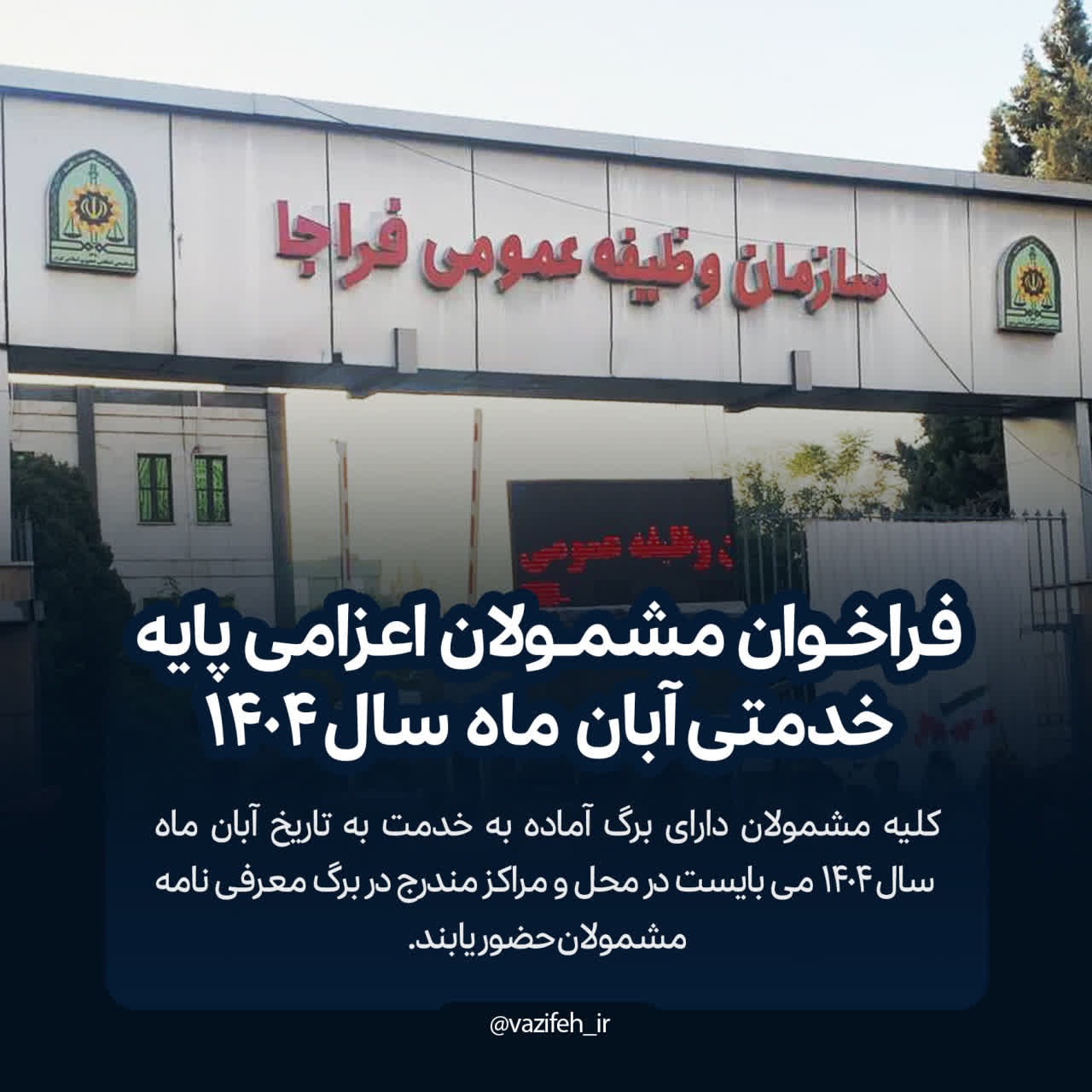سازمان وظیفه عمومی فراجا در اطلاعیه ای اعلام کرد: کلیه مشمولانی که برگ آماده به خدمت به تاریخ آبان ماه سال 1404دریافت کرده اند،می بایست با مراجعه به یکی از دفاتر خدمات الکترونیک انتظامی (پلیس+10) ، برگ معرفی نامه مشمولان به مراکز آموزش را دریافت و برابر اطلاعات مندرج درآن اقدام کنند.